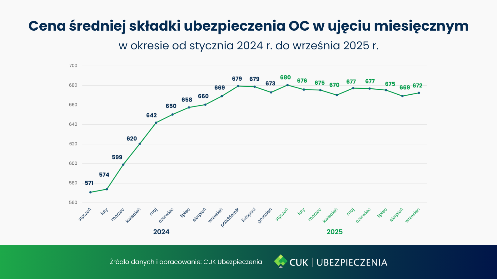 Od stycznia do września 2025 r. ceny OC oscylowały w przedziale ok. 669–680 zł (średnio ok. 675 zł), co kontrastuje z bardziej dynamicznymi wzrostami obserwowanymi w 2024 r. Stabilność ta może wynikać z konkurencyjnej polityki cenowej ubezpieczycieli oraz rosnącej świadomości kierowców korzystających z porównywarek OC i AC.