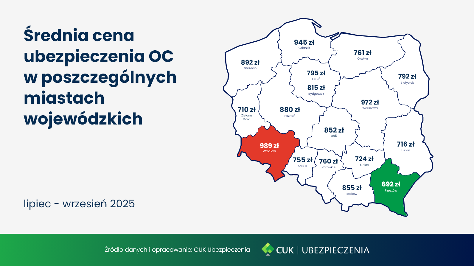Analiza cen OC w miastach wojewódzkich w III kwartale 2025 roku pokazuje, że najdrożej było we Wrocławiu – średnia składka wyniosła tam 989 zł. Tuż za nim uplasowały się Warszawa (972 zł) oraz Gdańsk (945 zł). Najtańszym miastem wojewódzkim okazał się tym razem Rzeszów – ze składką na poziomie 692 zł.