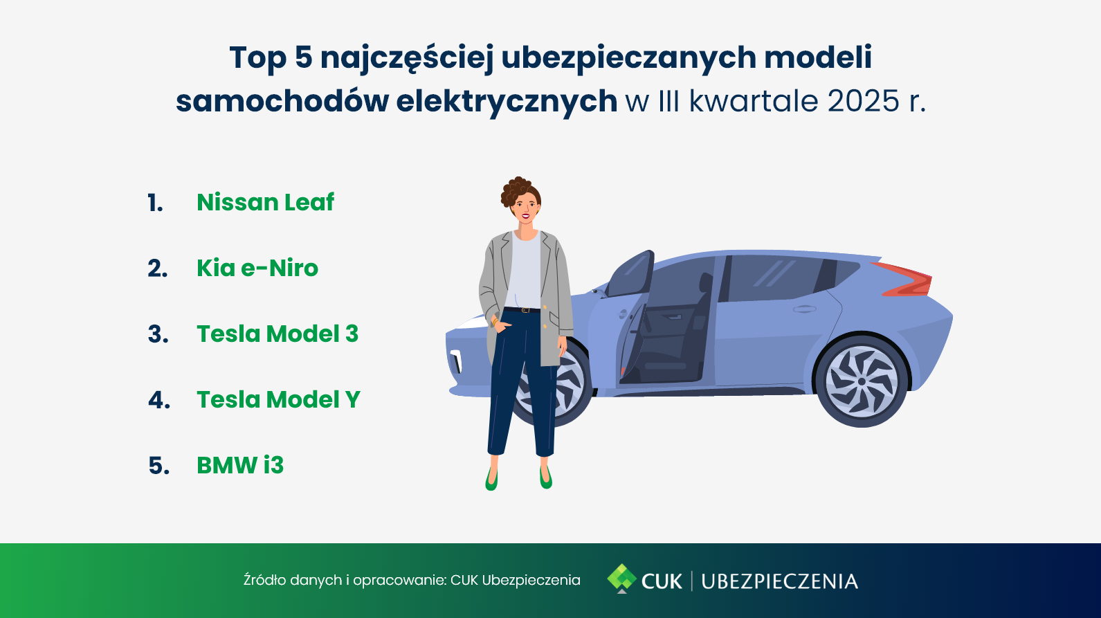 W III kwartale 2025 r. najczęściej ubezpieczane modele elektryczne to m.in. Nissan Leaf, Kia e-Niro, Tesla Model 3, Tesla Model Y oraz BMW i3. Na poziomie składek OC segment aut elektrycznych (EV) zachowuje korzystną przewagę kosztową względem aut spalinowych o zbliżonych parametrach — różnice nie są duże, ale systematycznie widoczne w danych, co potwierdza stabilizację cen w tym segmencie.