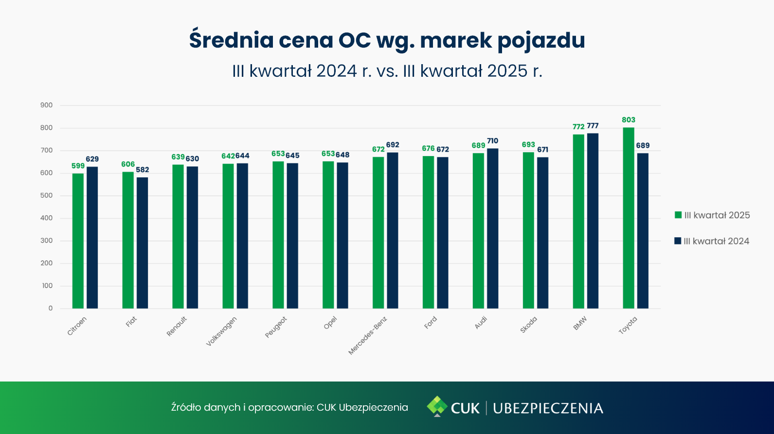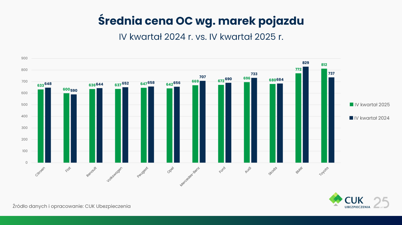 Cena OC a marka samochodu w 2025 - porównanie kwartalne w skali roku