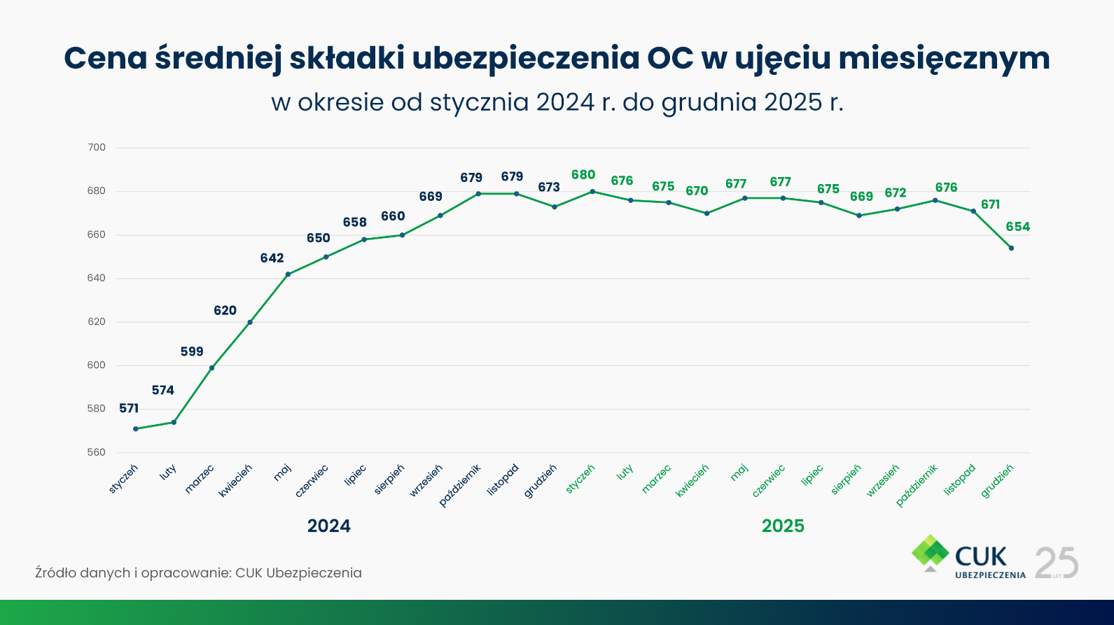 Od stycznia do grudnia 2025 r. ceny OC oscylowały w przedziale ok. 642–680 zł (średnio ok. 669 zł), co kontrastuje z bardziej dynamicznymi wzrostami obserwowanymi w 2024 r. Stabilność ta może wynikać z konkurencyjnej polityki cenowej ubezpieczycieli oraz rosnącej świadomości kierowców korzystających z porównywarek OC i AC.