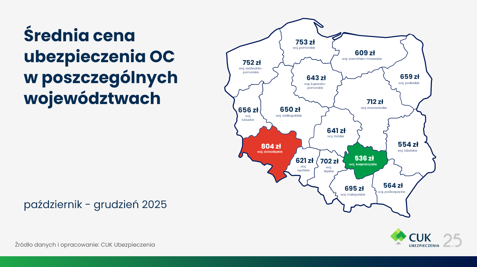 W czwartym kwartale 2025 roku zarysowały się wyraźne różnice regionalne. Najwyższą średnią składkę OC odnotowano w województwie dolnośląskim – 804 zł, natomiast najniższą w świętokrzyskim – 536 zł. Średnia krajowa w Q4 wyniosła 667 zł - 10 województw mieściło się w tym czasie poniżej średniej, natomiast 6 powyżej, co pokazuje sporą rozpiętość mimo ogólnej stabilizacji na poziomie kraju. Różnica między skrajnymi regionami sięgnęła 268 zł, co potwierdza, że lokalny „mikroklimat ryzyka” – natężenie ruchu, struktura wieku kierowców czy szkodowość – wciąż silnie kształtują ceny OC.
