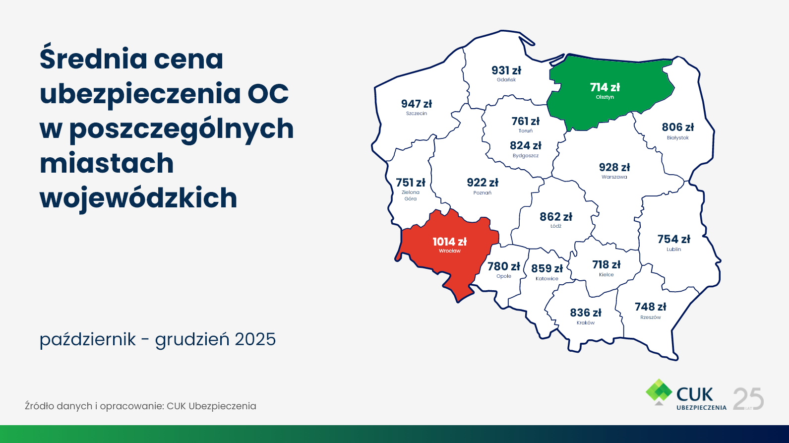 Analiza cen OC w miastach wojewódzkich w IV kwartale 2025 roku pokazuje, że najdrożej było we Wrocławiu – średnia składka wyniosła tam 1014 zł. Tuż za nim uplasowały się Szczecin (947 zł) oraz Gdańsk (931 zł). Najtańszym miastem wojewódzkim okazał się tym razem Olsztyn – ze składką na poziomie 714 zł.
