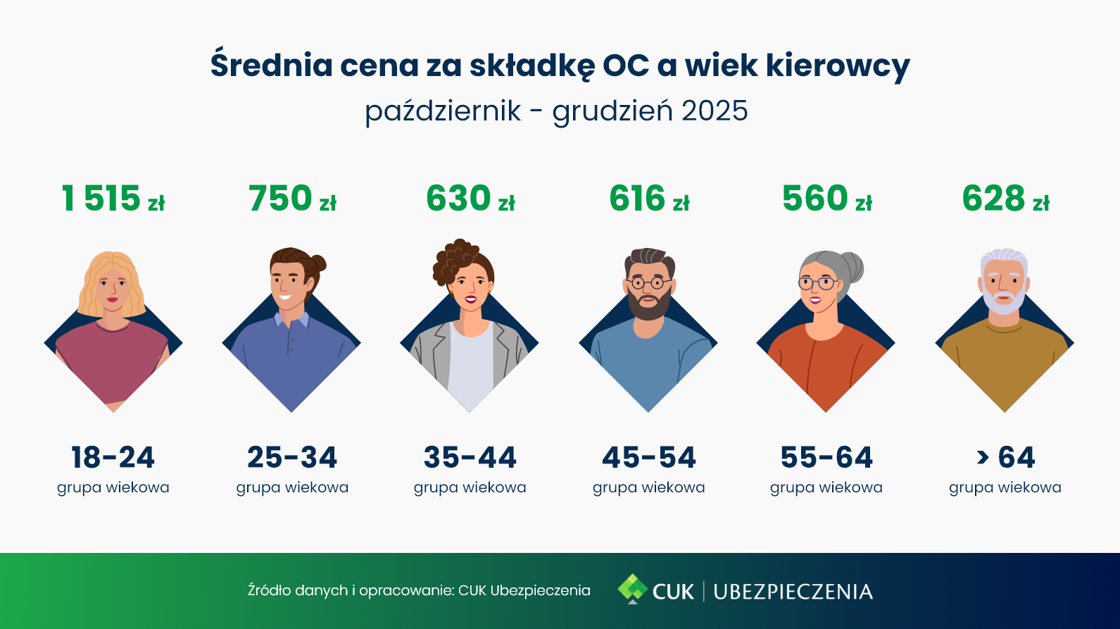 Różnice w cenach OC ze względu na wiek kierowcy są nadal bardzo wyraźne. Cena OC w IV kwartale 2025 dla kierowców w wieku 18–24 lata wynosiła średnio 1515 zł. Najniższe stawki uzyskiwali kierowcy w przedziale wiekowym 55-64 (560 zł). Widać wyraźnie, że im większe doświadczenie i historia ubezpieczeniowa, tym korzystniejsza oferta cenowa.