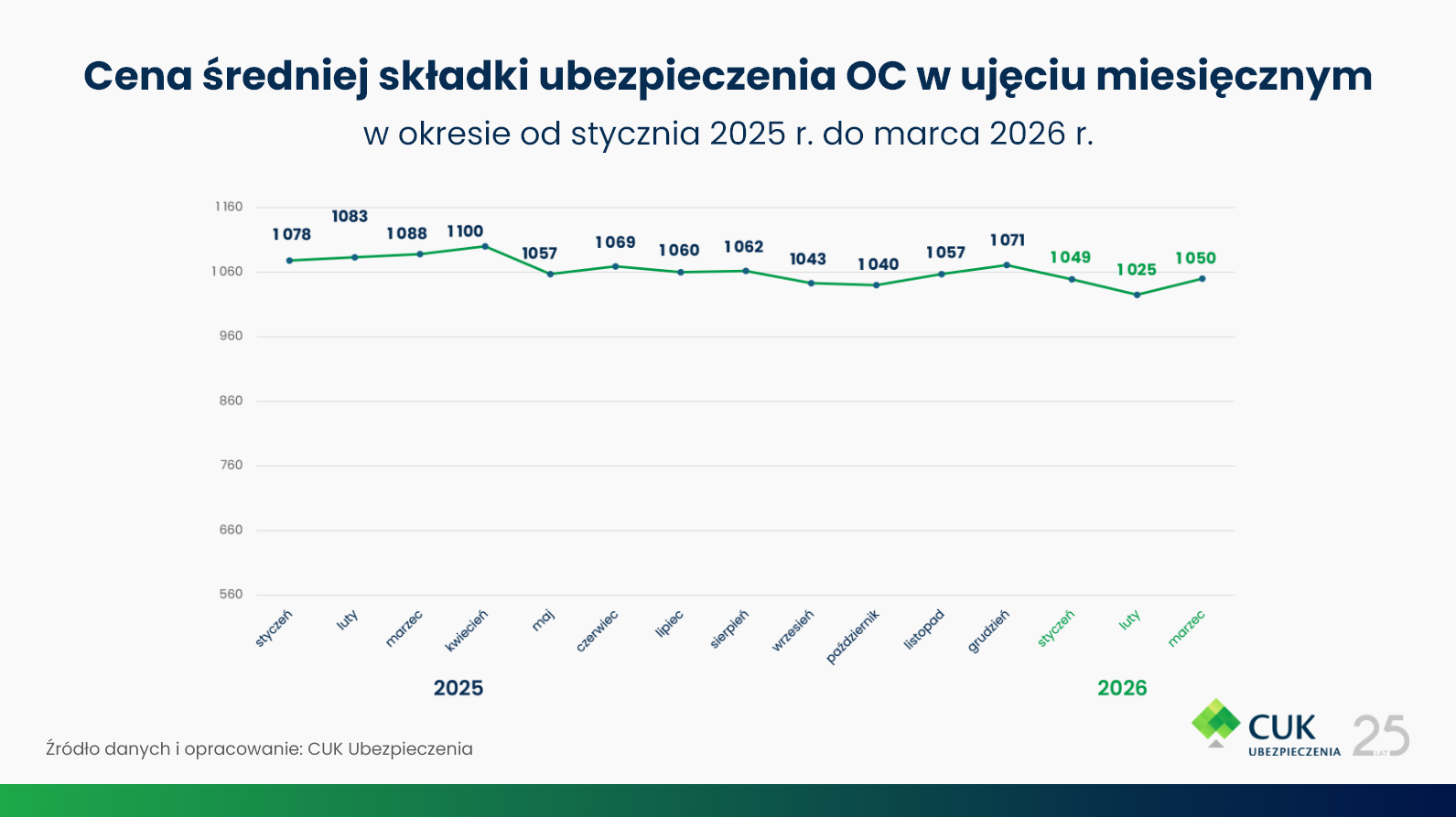 Cena OC zarówno w styczniu, jak i w lutym 2026 roku wyniosła przeciętnie 668 zł, co stanowi najwyższy wynik w tym kwartale. W marcu 2026 roku nastąpił delikatny spadek – średnia stawka za OC wyniosła 666 zł, co stanowi najniższą cenę za ubezpieczenie w pierwszym kwartale roku.