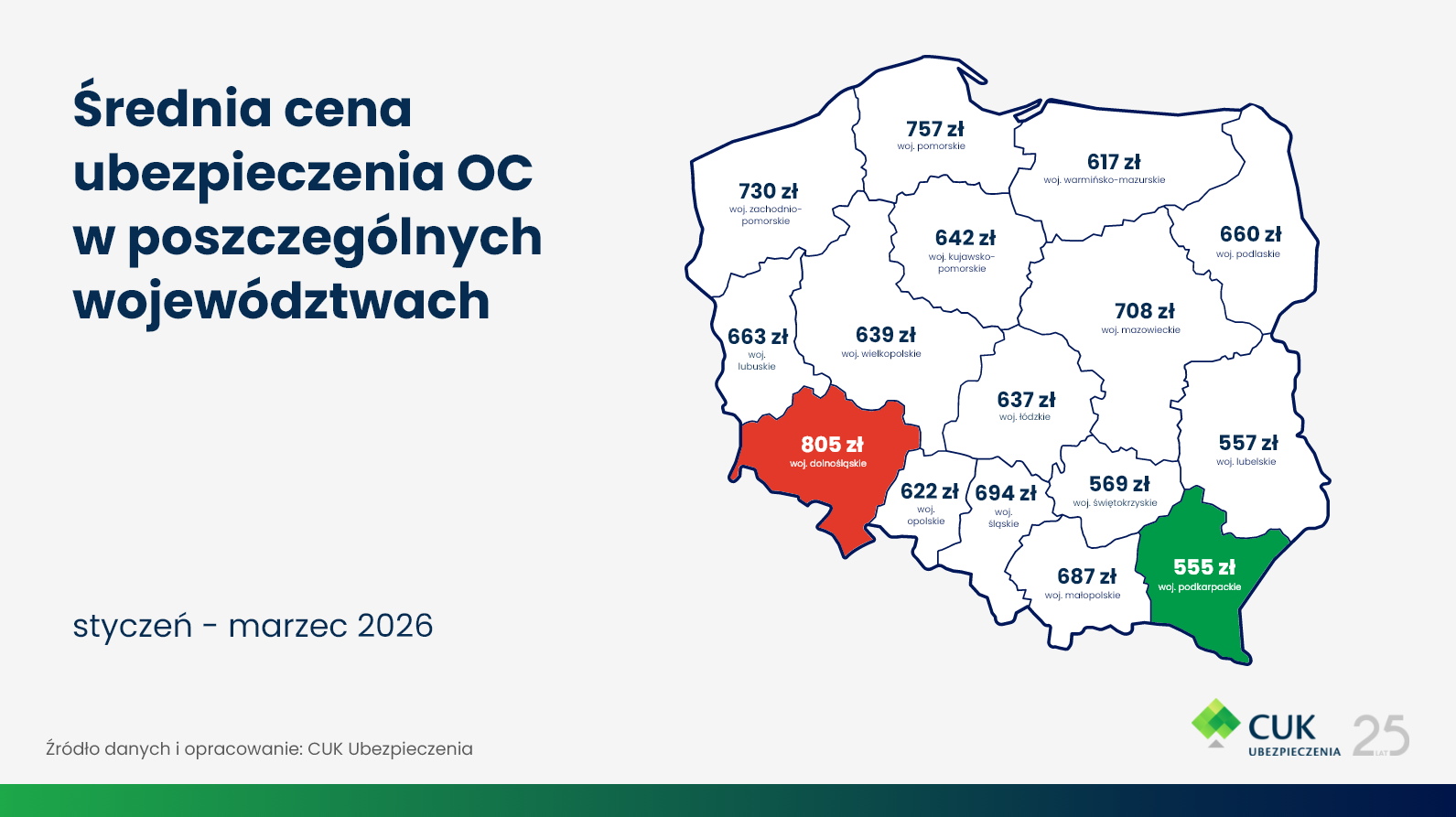 W pierwszym kwartale 2026 roku zarysowały się wyraźne różnice regionalne. Najwyższą średnią składkę OC odnotowano w województwie dolnośląskim – 805 zł, natomiast najniższą w podkarpackim – 555 zł. Średnia krajowa w Q1 wyniosła 667 zł – 10 województw mieściło się w tym czasie poniżej średniej, natomiast 6 powyżej, co pokazuje sporą rozpiętość mimo ogólnej stabilizacji na poziomie kraju. Różnica między skrajnymi regionami sięgnęła 250 zł, co potwierdza, że lokalny „mikroklimat ryzyka” – natężenie ruchu, struktura wieku kierowców czy szkodowość – wciąż silnie kształtują ceny OC.