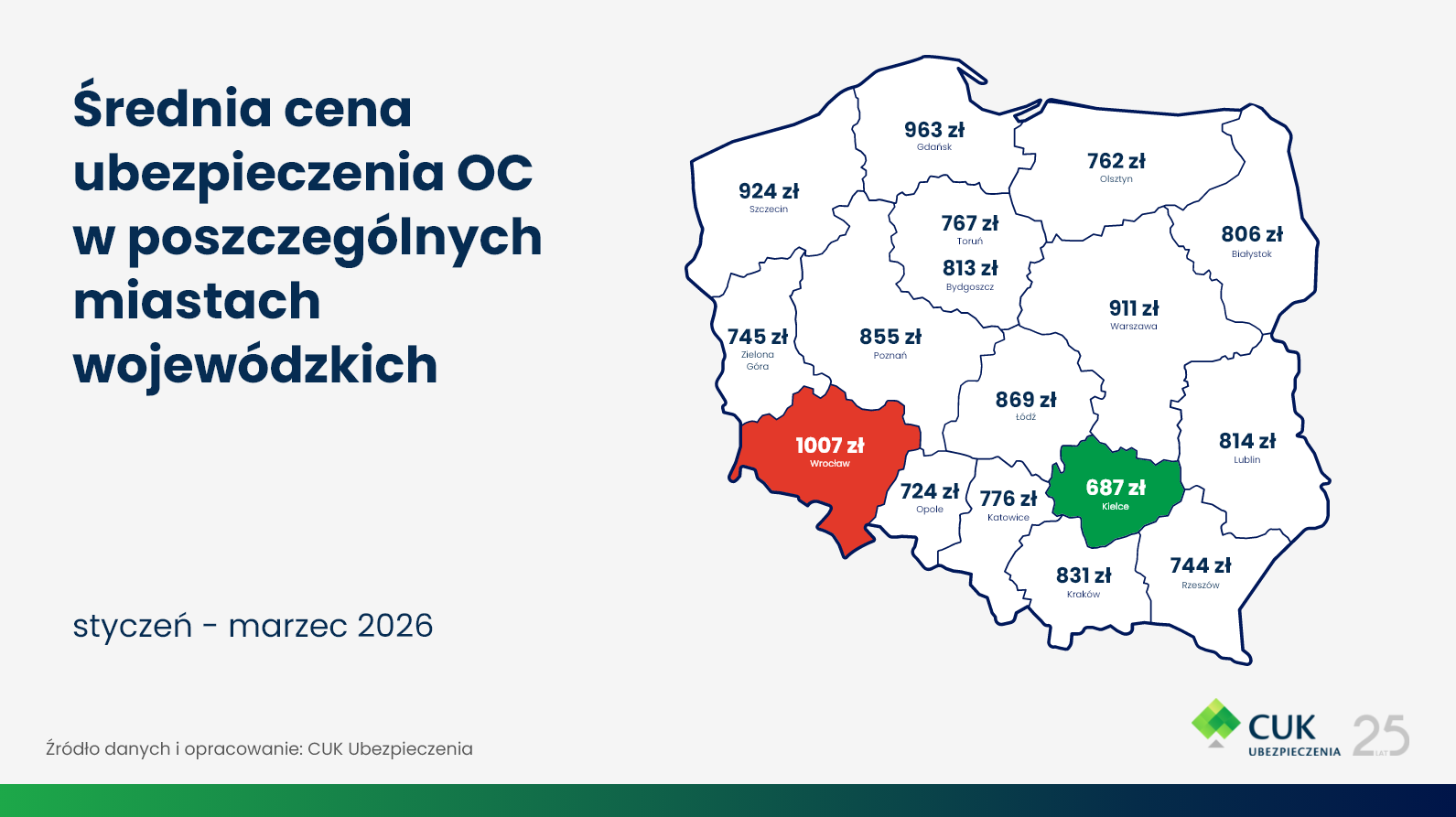 Analiza cen OC w miastach wojewódzkich w I kwartale 2026 roku pokazuje, że najdrożej było we Wrocławiu – średnia składka wyniosła tam 1007 zł. Tuż za nim uplasowały się Gdańsk (963 zł) oraz Szczecin (924 zł). Najtańszym miastem okazał się tym razem Tarnów – ze składką na poziomie 443 zł.