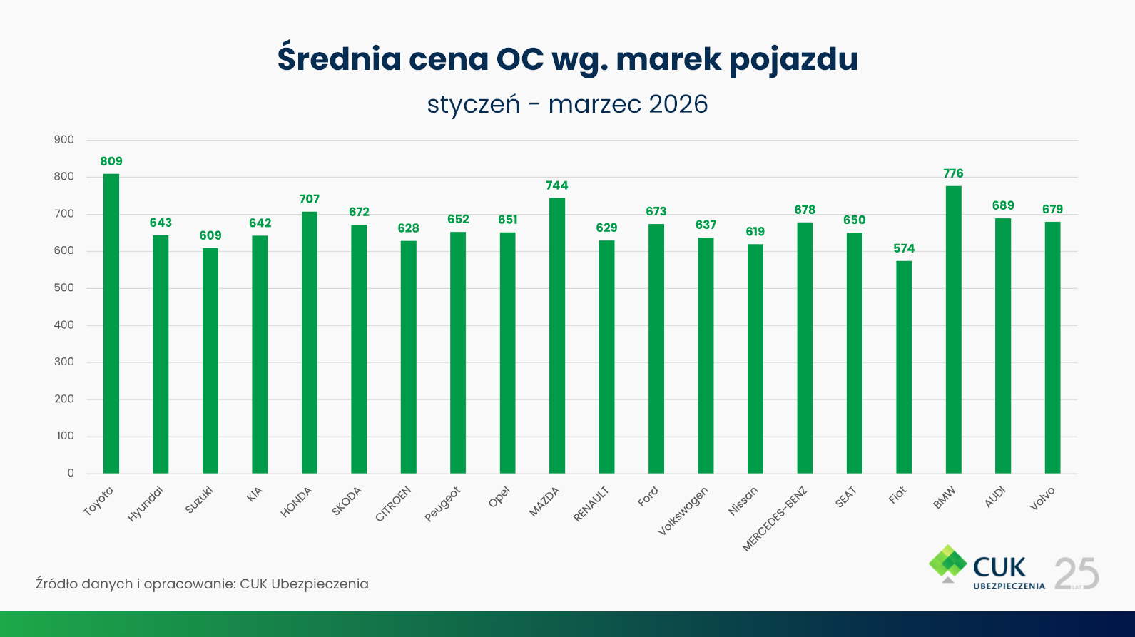 Cena OC a marka samochodu w 2026 – porównanie kwartalne w skali roku