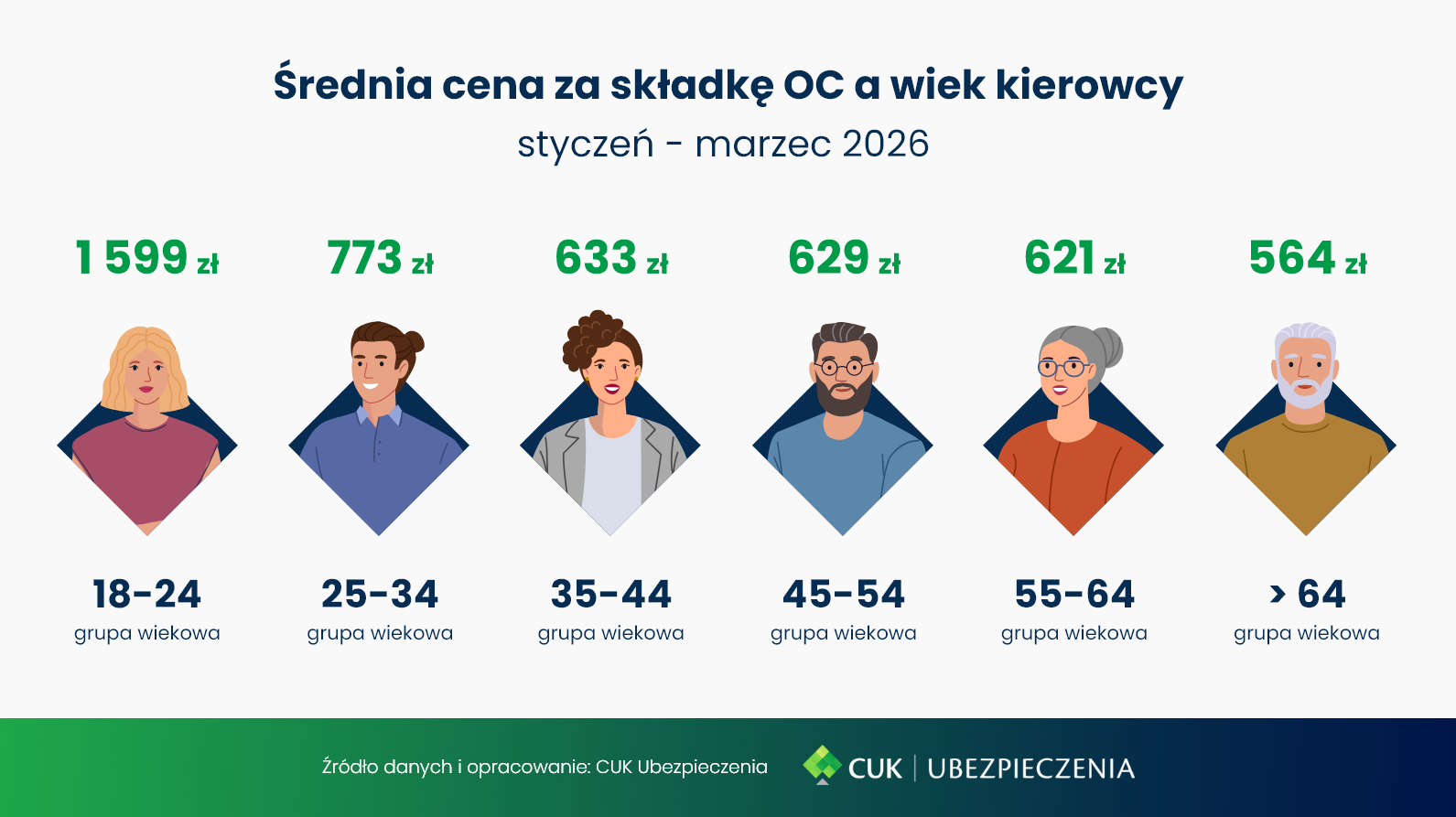 Różnice w cenach OC ze względu na wiek kierowcy są nadal bardzo wyraźne. Cena OC w I kwartale 2026 dla kierowców w wieku 18–24 lata wynosiła średnio 1599 zł. Najniższe stawki uzyskiwali kierowcy w przedziale wiekowym 55-64 (564 zł). Widać wyraźnie, że im większe doświadczenie i historia ubezpieczeniowa, tym korzystniejsza oferta cenowa.