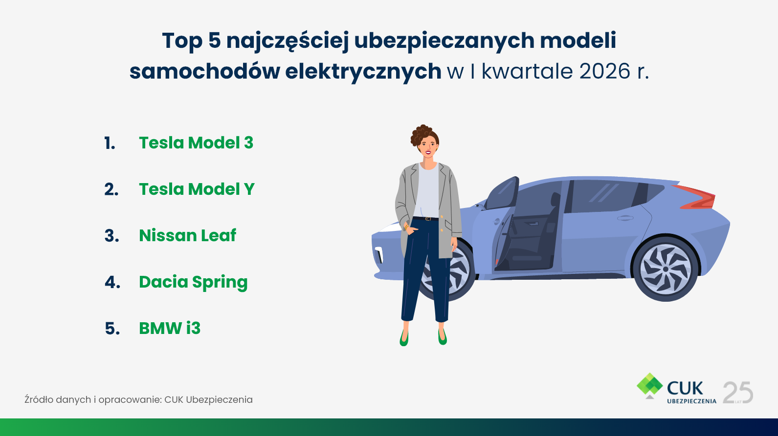 W I kwartale 2026 r. najczęściej ubezpieczane modele elektryczne to m.in. Tesla Model 3, Tesla Model Y, Nissan Leaf, Dacia Spring oraz BMW i3. Na poziomie składek OC, segment aut elektrycznych (EV) zachowuje korzystną przewagę kosztową względem aut spalinowych o zbliżonych parametrach — różnice nie są duże, ale systematycznie widoczne w danych, co potwierdza stabilizację cen w tym segmencie.