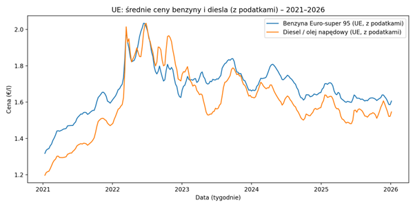 Źródło danych historycznych: European Commission – Weekly Oil Bulletin, średnie ceny benzyny i diesla w UE (z podatkami).
