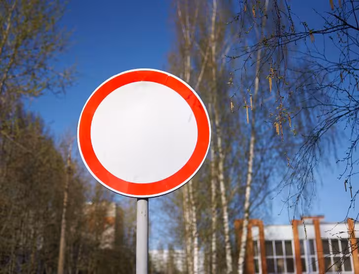 A jak wygląda znak zakazu ruchu w obu kierunkach? To pionowy znak. Na okrągłej tarczy w białym kolorze znajduje się tylko czerwona obwódka.