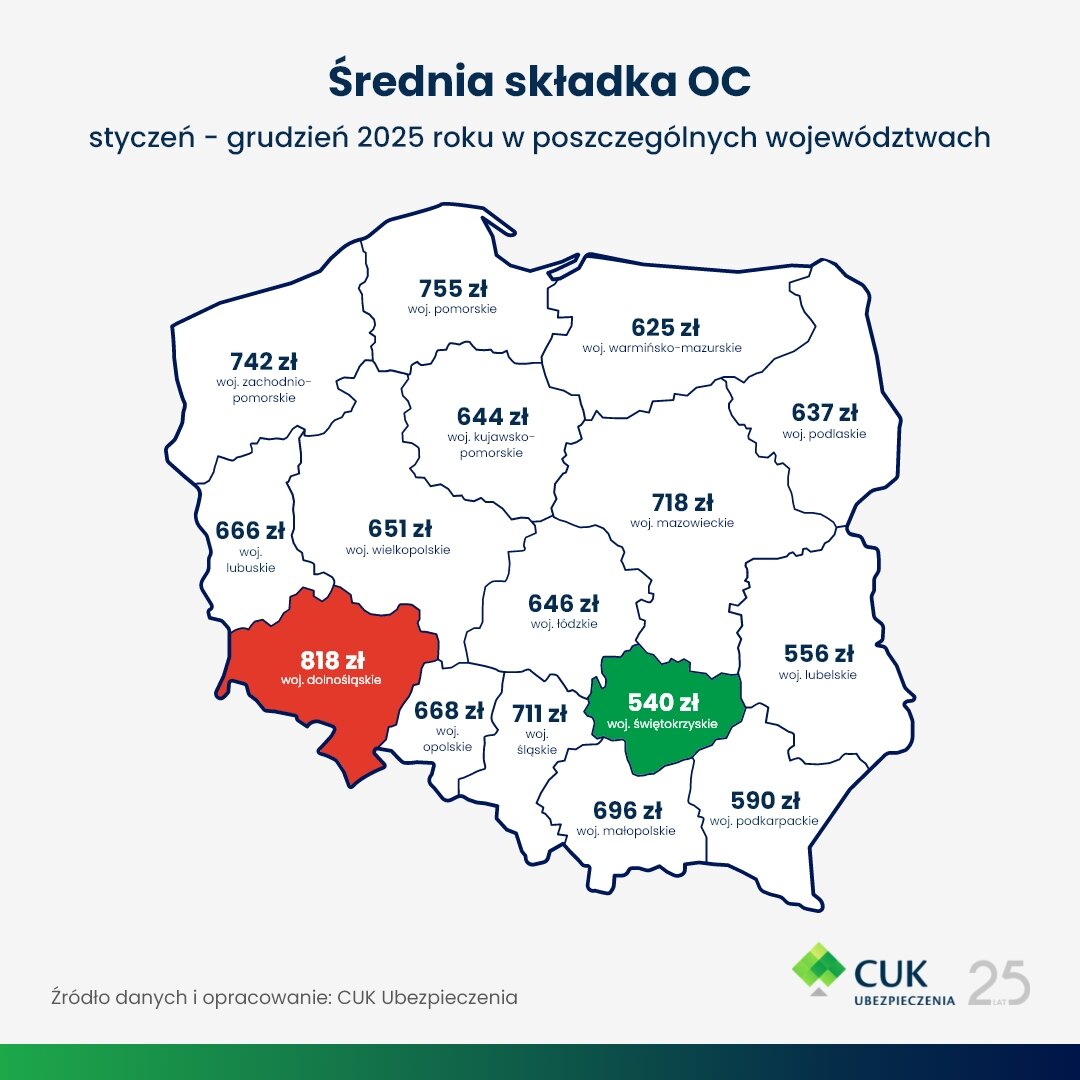 Ceny OC pozostają silnie zróżnicowane regionalnie. Najdroższym województwem pozostaje dolnośląskie (818 zł), a kolejne miejsca zajmują: pomorskie (756 zł) i zachodniopomorskie (743 zł). Na drugim biegunie znalazły się regiony wschodnie – świętokrzyskie (540 zł) i lubelskie (556 zł). Różnica między najdroższym a najtańszym województwem wyniosła niemal 280 zł.