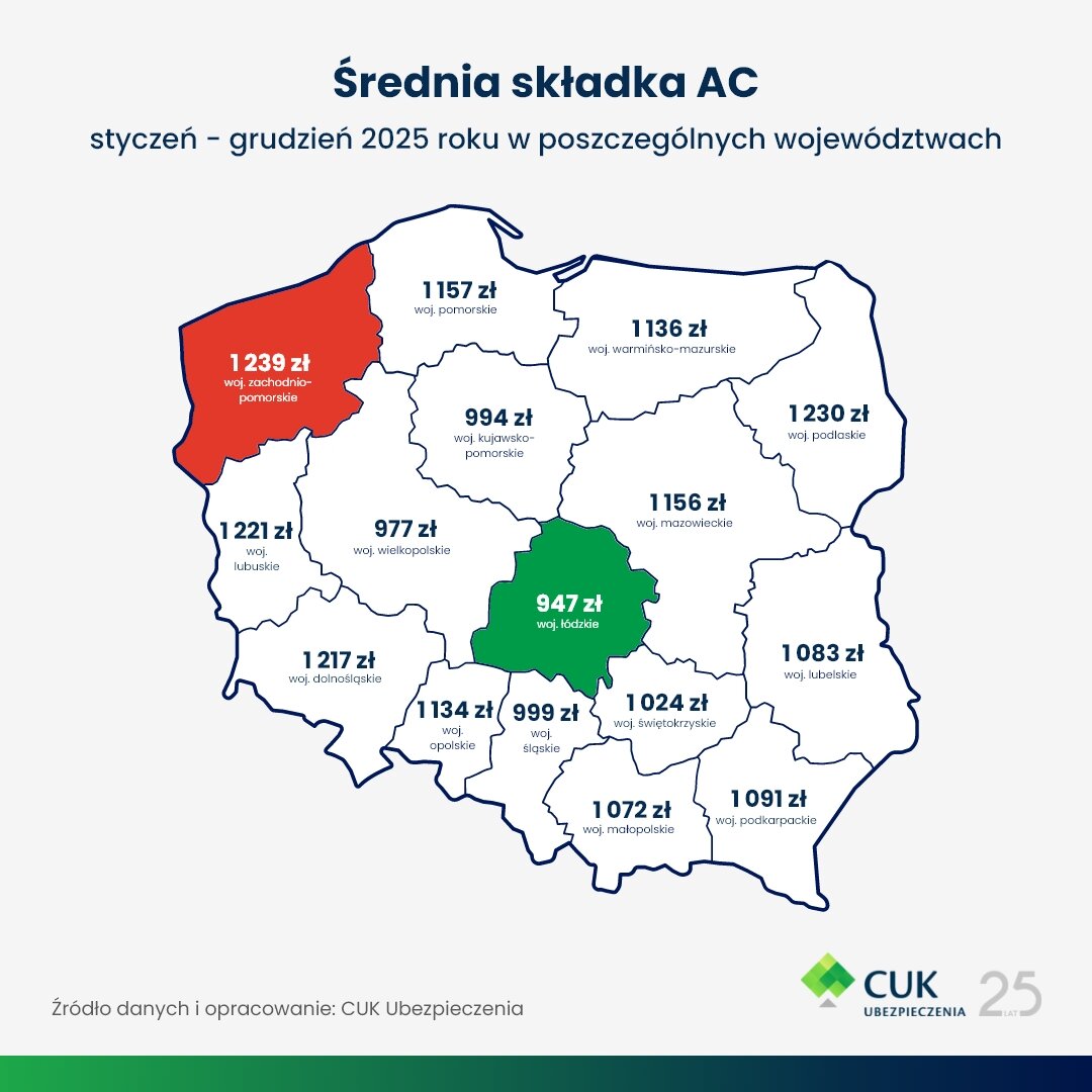 Rok 2025 przyniósł wyraźną stabilizację cen autocasco. Średnia składka AC wyniosła 1066 zł i praktycznie nie zmieniła się względem roku poprzedniego. Najdroższe AC płacili kierowcy w zachodniopomorskim (1238 zł), podlaskim (1222 zł) i dolnośląskim (1217 zł). Najtańsze województwa to łódzkie (949 zł), wielkopolskie (975 zł) i kujawsko-pomorskie (993 zł).